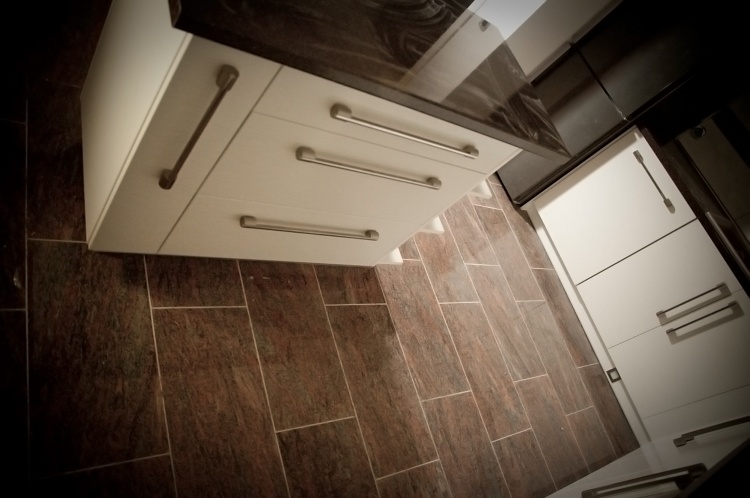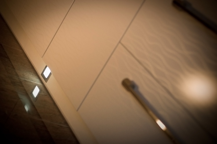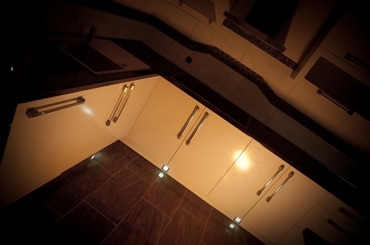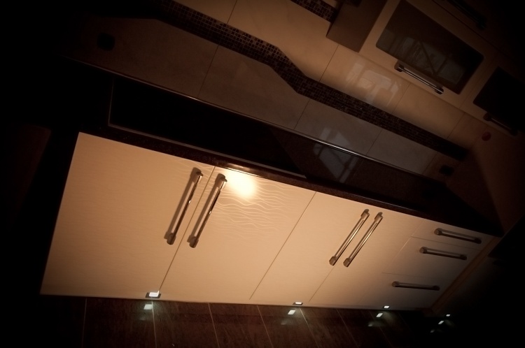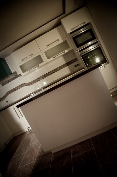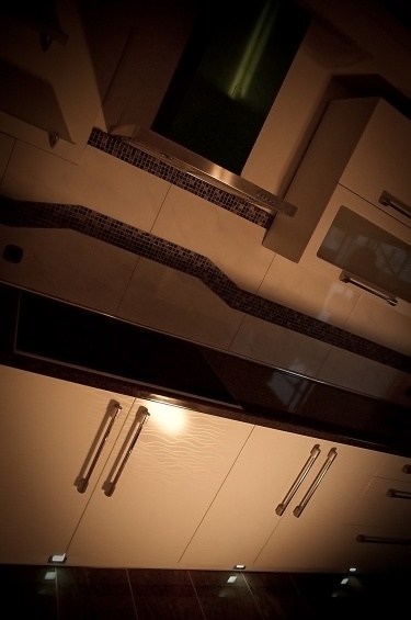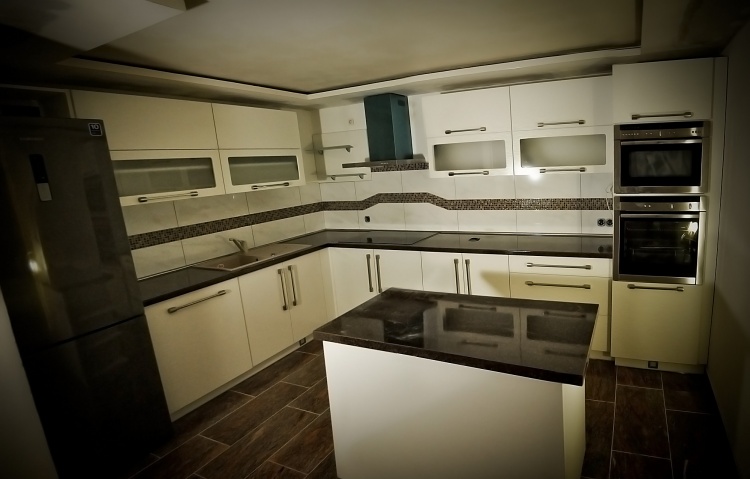 Moderní design, pracovní prostor a špičkové technologie - tak by se dala stručně charakterizovat kuchyně navržená a zhotovená pro početnou rodinu. Přestože samotná místnost v prvním patře rodinného domu není svou výměrou nikterak nadprůměrná, využili jsme plně její potenciál. Kuchyňská linka je na klasickém L půdorysu doplněném o ostrůvek, takže pracovní plocha čítá dohromady téměř sedm metrů. Špičkové kování firmy BLUM zajišťuje bezchybný provoz osmi dvířek, osmi výklopů a sedmi zásuvek. Veškeré spotřebiče jsou vlajkové lodě ve svých kategoriích. Veškeré přední plochy jsou zhotoveny ve vysokém lesku stejně jako pracovní deska. Jednoduchá barevná kombinace kuchyně je doplněna nerezovými doplňky - úchytky, lišty, rámy spotřebičů, digestoř... Zajímavostí je zde soklové osvětlení usnadňující orientaci v prostoru kuchyňské linky při zhasnutém centrálním světle.